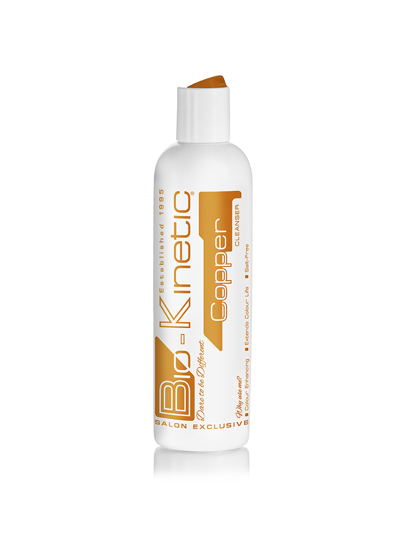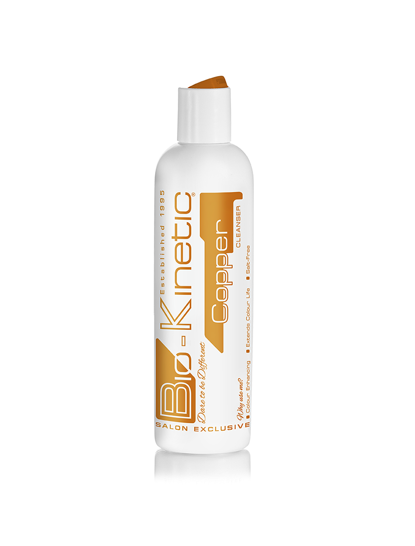 Bio-Kinetic Copper Cleanse has been formulated to enhance colour. This product has a two-fold action which includes cleansing and colour boosting. The nett effect of Copper Cleanse is to counter colour fading and intensify gold, golden-copper and copper hair colours. This product can be used in conjunction with other Bio-Kinetic shampoos.