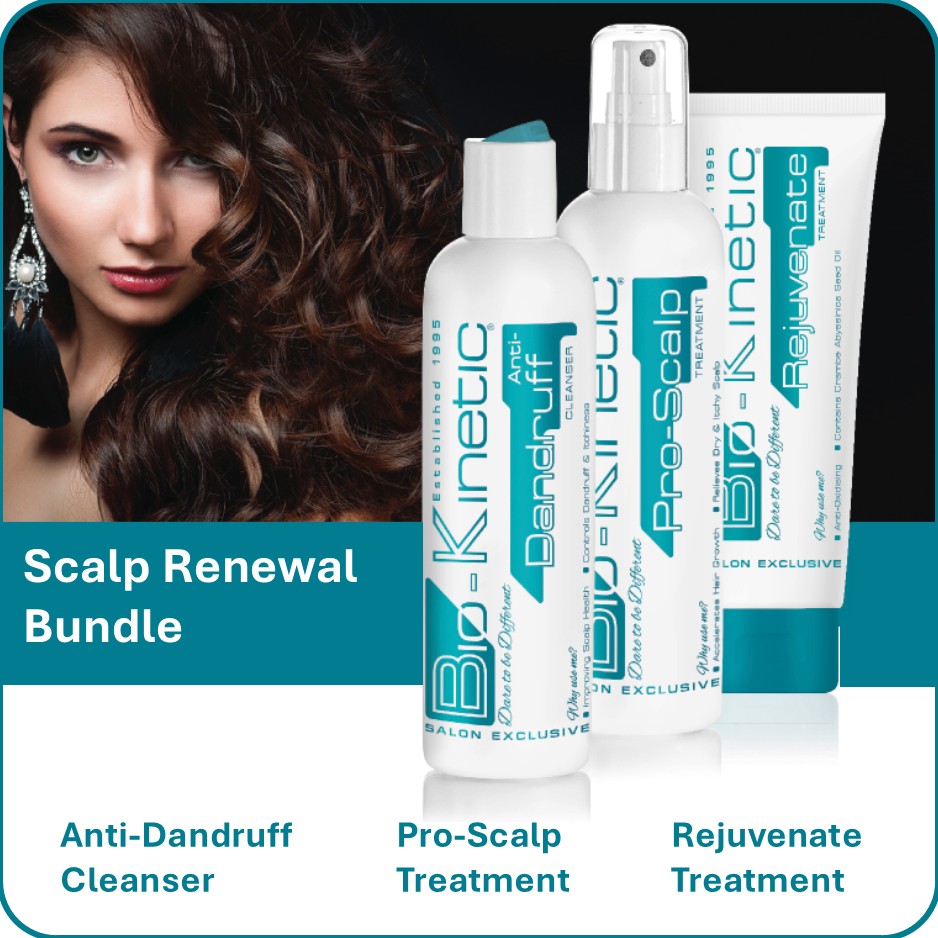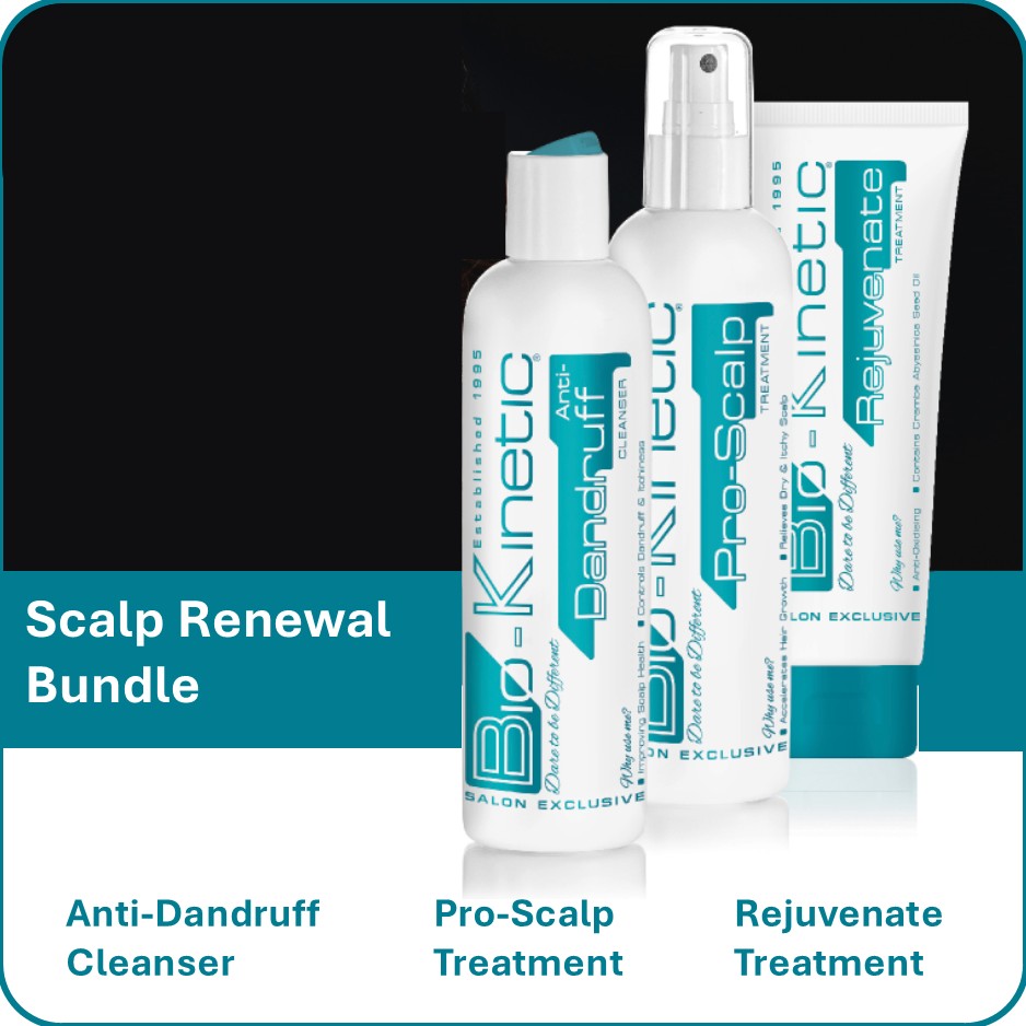 Revitalize your scalp and promote healthy hair with the Bio-Kinetic Scalp Renewal Bundle. Start with a free Anti-Dandruff Cleanse, designed to control common dandruff, relieve itchiness, and refresh the scalp with its gentle disinfecting formula. Follow up with Rejuvenate Treatment, an antioxidant-rich blend with Keratin and Panthenol to enhance elasticity and color retention, leaving hair more manageable and vibrant. Finish with Pro Scalp, a quick-drying treatment that soothes dryness, adds volume, and supports accelerated hair growth. This bundle is perfect for a balanced, healthy scalp and nourished hair.