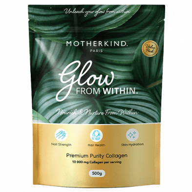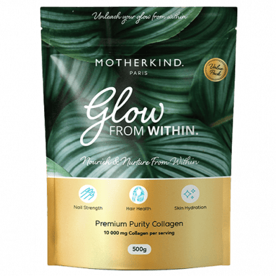 Motherkind Glow From Within is premium pure hydrolysate collagen peptides. Collagen makes up 70% of your dermis, therefore, providing your body with collagen may help maintain a healthy dermis in order to prevent thinning of hair and to rejuvenate hair loss. In addition it plays a role in strengthening skin, plus may benefit both elasticity and hydration. Glow From within Collagen supports integrity of our cartilage, supports in tightening, strengthening and toning the entire digestive system, and supports our sleep quality.