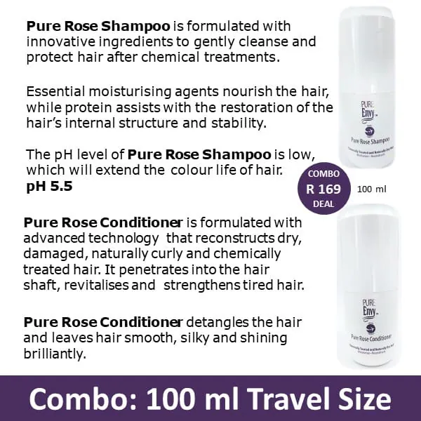 Pure Rose Shampoo & Conditioner is formulated for hair subjected to harsh climatic conditions and chemical treatments. Essential moisturizing agents nourish the hair while protein assist with the restoration of the hair’s internal structure and stability